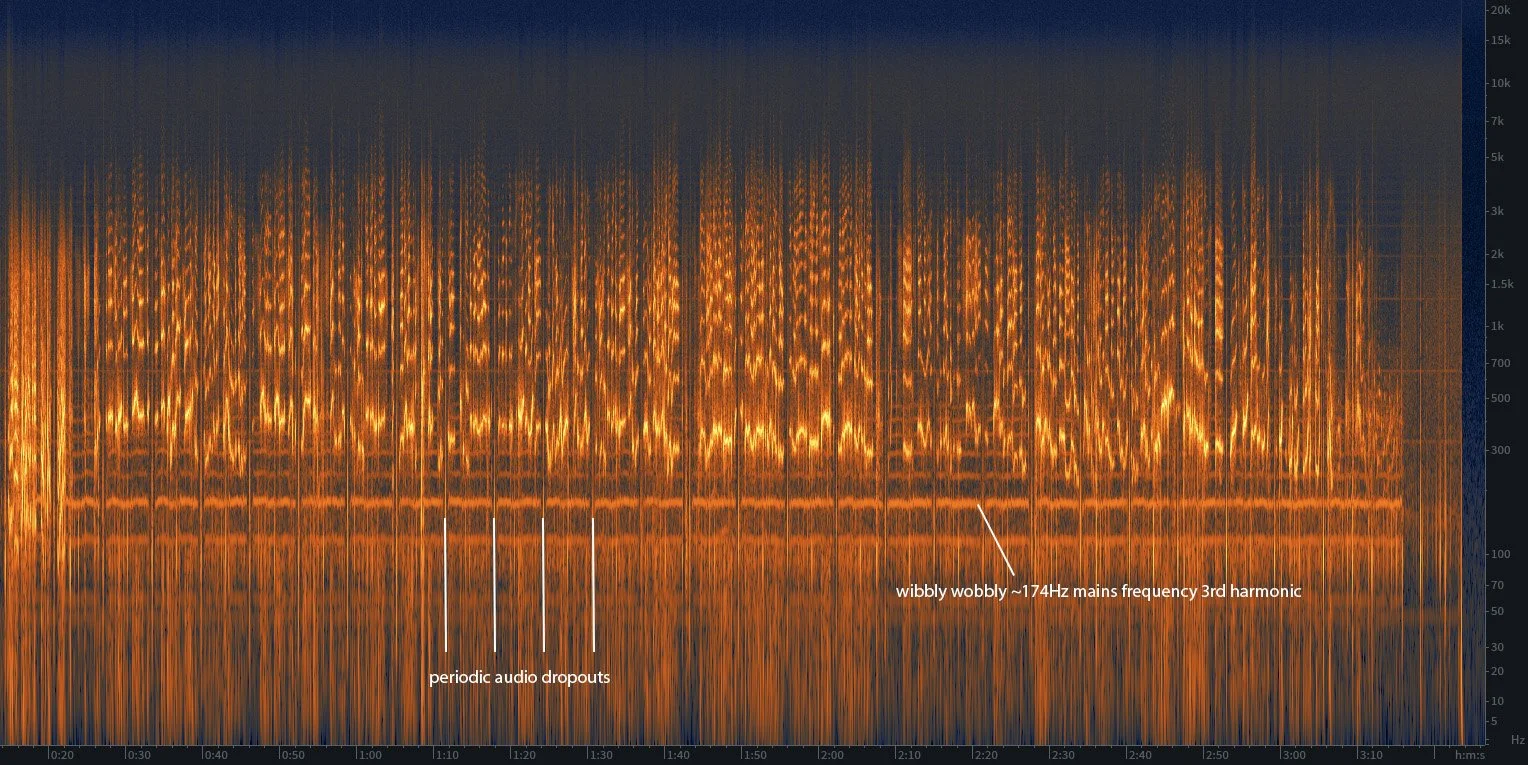 Upon watching the results, I couldn’t resist to offer Marc some extra help with the post-processing of the recovered audio. I got in touch and he promptly sent me the audio file. I rushed to give it a listen and started working on it. I figured some processing could be done to remove some unwanted blemishes and improve the overall intelligibility of the recording. The process involved correction for pitch due to the machines’ transport mechanism variations, flutter, noise reduction, corrective EQ for compensation of the systems’ frequency response and a couple other things such as attenuating the “thumps” caused by the periodic pass of both tape creases due to the way it was stored. When dealing with artifacts like these, one can take advantage of what would in most cases be purely a technical issue. In this case, having a mains ground hum on the recording can be quite helpful to assert the correct speed of the tape since it fingerprints the original recording with a pilot tone that can be used to correct for variations on the playback speed, including wobble, flutter and the baseline tape speed. You can hear the resulting difference below.
